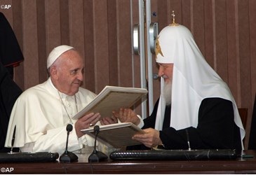 La grâce de Notre Seigneur Jésus Christ, l’amour de Dieu le Père et la communion du Saint-Esprit soit avec vous tous » (2 Co 13, 13). 3. Nous étant rencontrés loin des vieilles querelles de l’« Ancien Monde », nous sentons avec une force particulière la nécessité d’un labeur commun des catholiques et des orthodoxes, appelés, avec douceur et respect, à rendre compte au monde de l’espérance qui est en nous (cf. 1 P 3, 15). 4. Nous rendons grâce à Dieu pour les dons que nous avons reçus par la venue au monde de son Fils unique. Nous partageons la commune Tradition spirituelle du premier millénaire du christianisme. Les témoins de cette Tradition sont la Très Sainte Mère de Dieu, la Vierge Marie, et les saints que nous vénérons. Parmi eux se trouvent d’innombrables martyrs qui ont manifesté leur fidélité au Christ et sont devenus « semence de chrétiens ». 5. Malgré cette Tradition commune des dix premiers siècles, catholiques et orthodoxes, depuis presque mille ans, sont privés de communion dans l’Eucharistie. Nous sommes divisés par des blessures causées par des conflits d’un passé lointain ou récent, par des divergences, héritées de nos ancêtres, dans la compréhension et l’explicitation de notre foi en Dieu, un en Trois Personnes – Père, Fils et Saint Esprit. Nous déplorons la perte de l’unité, conséquence de la faiblesse humaine et du péché, qui s’est produite malgré la Prière sacerdotale du Christ Sauveur : « Que tous soient un. Comme toi, Père, tu es en moi et moi en toi, qu’eux aussi soient un en nous » (Jn 17, 21). 6. Conscients que de nombreux obstacles restent à surmonter, nous espérons que notre rencontre contribue au rétablissement de cette unité voulue par Dieu, pour laquelle le Christ a prié. Puisse notre rencontre inspirer les chrétiens du monde entier à prier le Seigneur avec une ferveur renouvelée pour la pleine unité de tous ses disciples ! Puisse-t-elle, dans un monde qui attend de nous non pas seulement des paroles mais des actes, être un signe d’espérance pour tous les hommes de bonne volonté ! 7. Déterminés à entreprendre tout ce qui nécessaire pour surmonter les divergences historiques dont nous avons hérité, nous voulons unir nos efforts pour témoigner de l’Evangile du Christ et du patrimoine commun de l’Eglise du premier millénaire, répondant ensemble aux défis du monde contemporain. Orthodoxes et catholiques doivent apprendre à porter un témoignage unanime à la vérité dans les domaines où cela est possible et nécessaire. La civilisation humaine est entrée dans un moment de changement d’époque. Notre conscience chrétienne et notre responsabilité pastorale ne nous permettent pas de rester inactifs face aux défis exigeant une réponse commune. 9. Nous appelons la communauté internationale à des actions urgentes pour empêcher que se poursuive l’éviction des chrétiens du Proche Orient. Elevant notre voix pour défendre les chrétiens persécutés, nous compatissons aussi aux souffrances des fidèles d’autres traditions religieuses devenus victimes de la guerre civile, du chaos et de la violence terroriste. 10. En Syrie et en Irak, la violence a déjà emporté des milliers de vies, laissant des millions de gens sans abri ni ressources. Nous appelons la communauté internationale à mettre fin à la violence et au terrorisme et, simultanément, à contribuer par le dialogue à un prompt rétablissement de la paix civile. Une aide humanitaire à grande échelle est indispensable aux populations souffrantes et aux nombreux réfugiés dans les pays voisins. Nous demandons à tous ceux qui pourraient influer sur le destin de ceux qui ont été enlevés, en particulier des Métropolites d’Alep Paul et Jean Ibrahim, séquestrés en avril 2013, de faire tout ce qui est nécessaire pour leur libération rapide. 11. Nous élevons nos prières vers le Christ, le Sauveur du monde, pour le rétablissement sur la terre du Proche Orient de la paix qui est « le fruit de la justice » (Is 32, 17), pour que se renforce la coexistence fraternelle entre les diverses populations, Eglises et religions qui s’y trouvent, pour le retour des réfugiés dans leurs foyers, la guérison des blessés et le repos de l’âme des innocents tués. Nous adressons un fervent appel à toutes les parties qui peuvent être impliquées dans les conflits pour qu’elles fassent preuve de bonne volonté et s’asseyent à la table des négociations. Dans le même temps, il est nécessaire que la communauté internationale fasse tous les efforts possibles pour mettre fin au terrorisme à l’aide d’actions communes, conjointes et coordonnées. 12. Nous nous inclinons devant le martyre de ceux qui, au prix de leur propre vie, témoignent de la vérité de l’Evangile, préférant la mort à l’apostasie du Christ. Nous croyons que ces martyrs de notre temps, issus de diverses Eglises, mais unis par une commune souffrance, sont un gage de l’unité des chrétiens. A vous qui souffrez pour le Christ s’adresse la parole de l’apôtre : « Très chers !… dans la mesure où vous participez aux souffrances du Christ, réjouissez-vous, afin que, lors de la révélation de Sa gloire, vous soyez aussi dans la joie et l’allégresse » (1 P 4, 12-13). 13. En cette époque préoccupante est indispensable le dialogue interreligieux. Les différences dans la compréhension des vérités religieuses ne doivent pas empêcher les gens de fois diverses de vivre dans la paix et la concorde. Dans les circonstances actuelles, les leaders religieux ont une responsabilité particulière pour éduquer leurs fidèles dans un esprit de respect pour les convictions de ceux qui appartiennent à d’autres traditions religieuses. Les tentatives de justifications d’actions criminelles par des slogans religieux sont absolument inacceptables. Aucun crime ne peut être commis au nom de Dieu, « car Dieu 