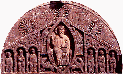 le tympan roman. Le Christ est assis en majesté entre les quatre